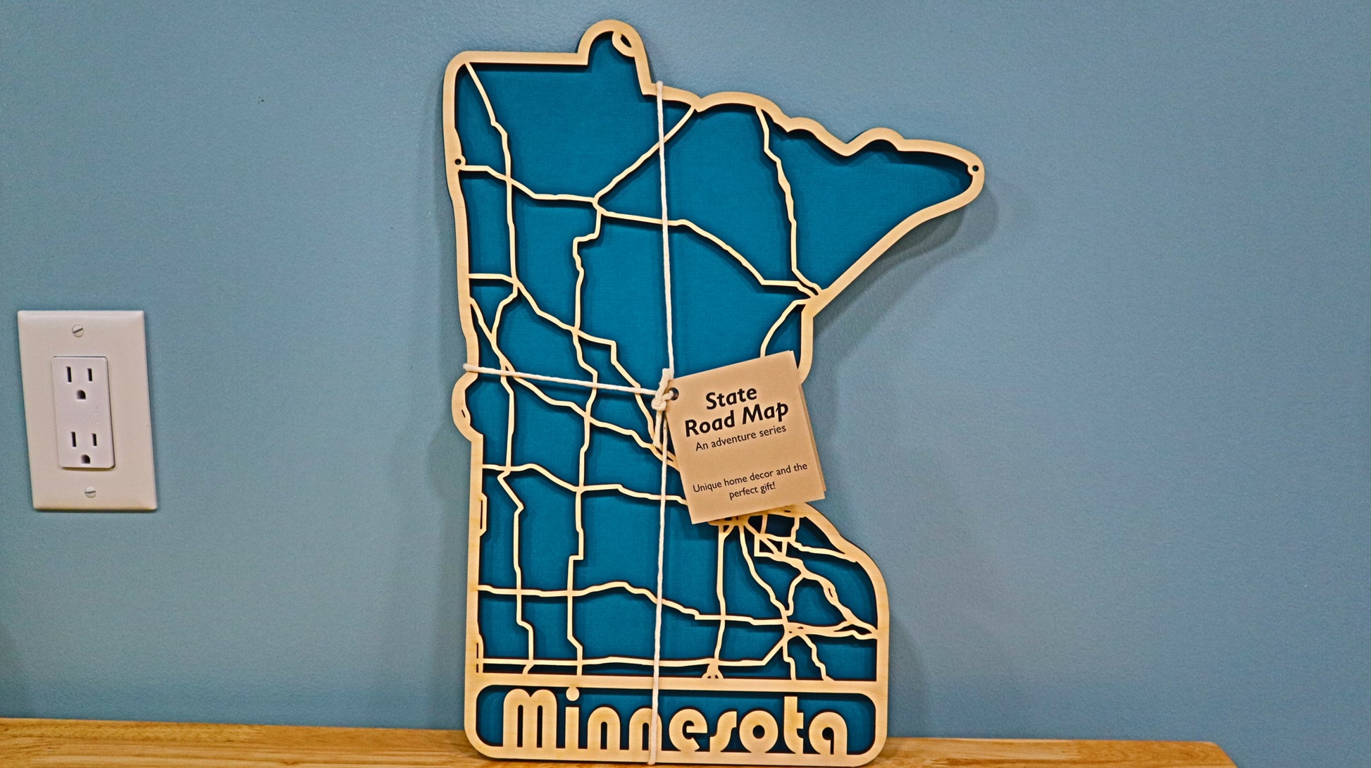 Show your home state some love with this unique state road map crafted from 1/4 inch wood. This stylish piece beautifully highlights the main roads of Minnesota, making it a perfect addition to any home.